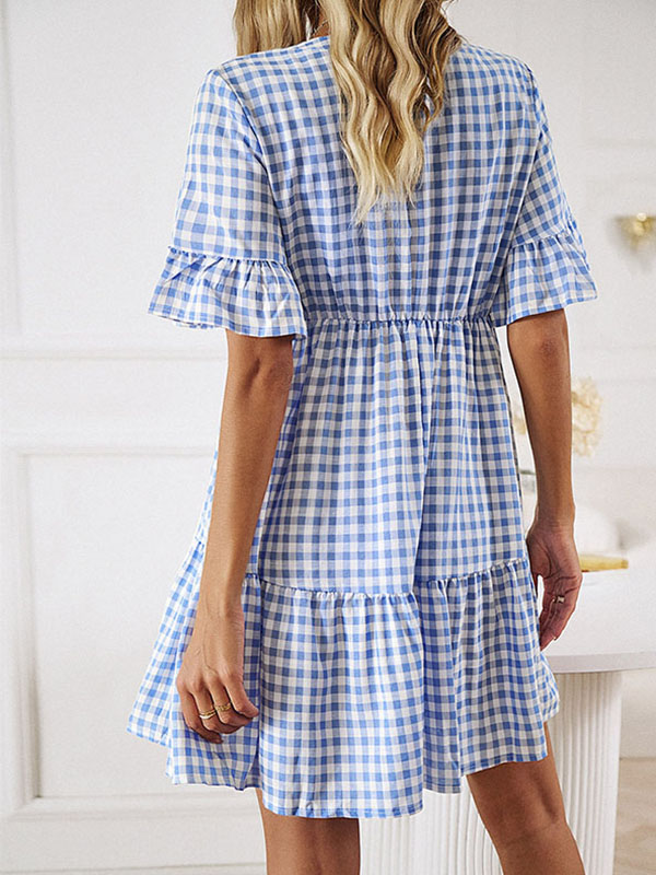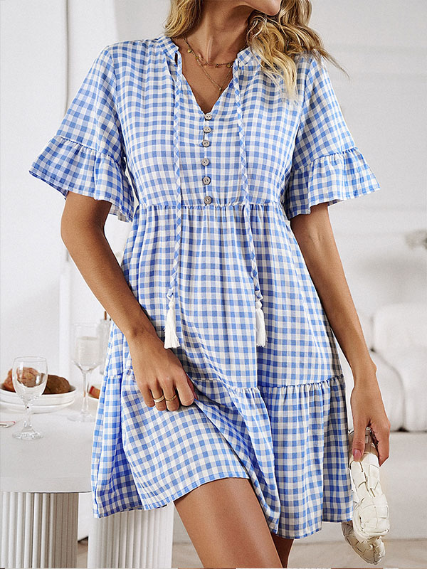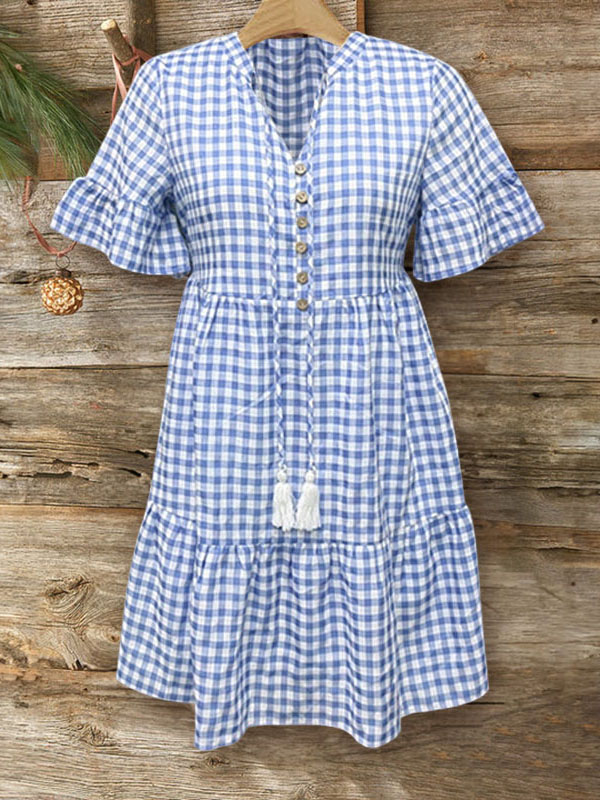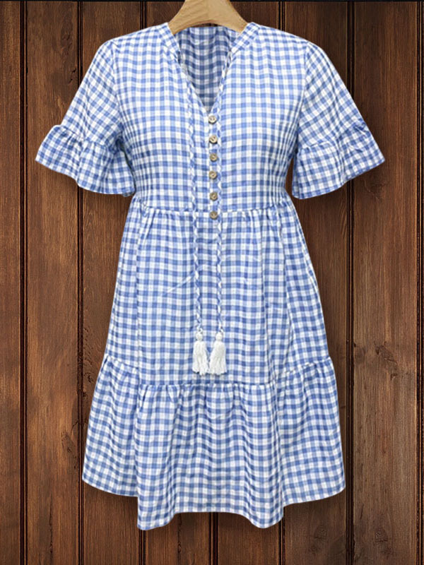 This plaid dress exudes vintage chic with playful ruffle detailing and a classic blue plaid print. The long tie with a tassel at the neckline adds a youthful feel.