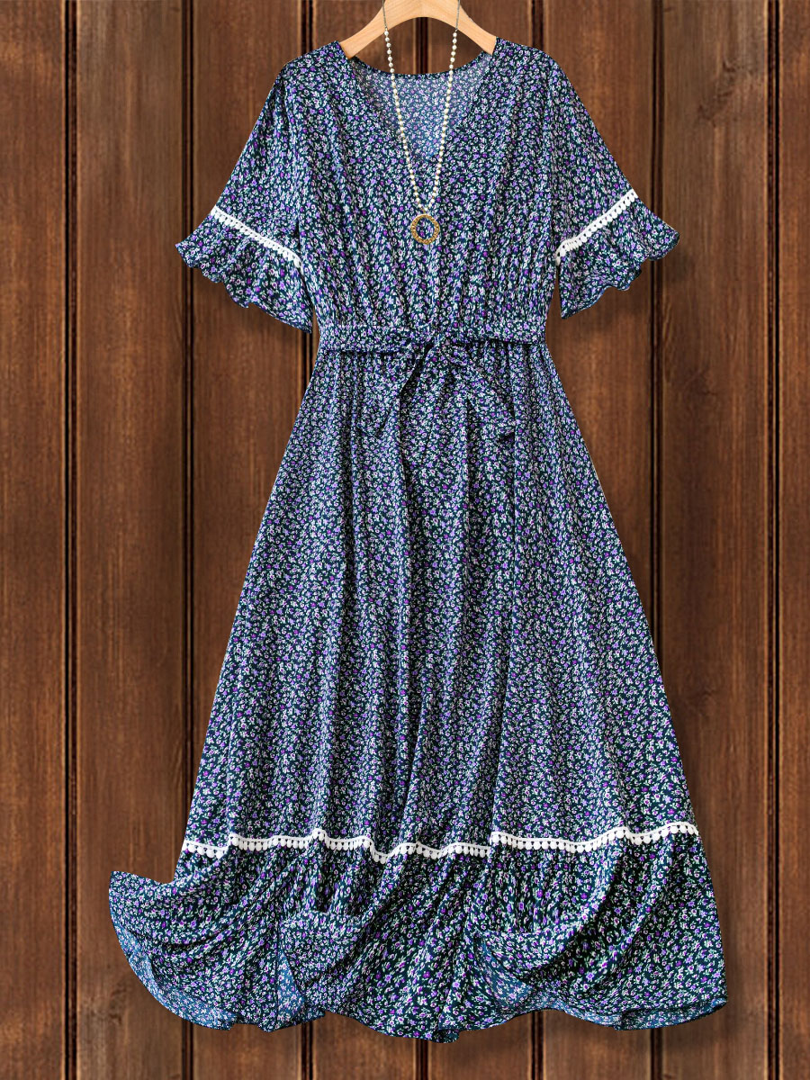 This floral print dress features a lovely colorful floral print. The lace webbing details at the sleeves and hem adds a touch of sweetness. It's a perfect piece for adding an elegant touch to your wardrobe, whether attending a semi-formal event or just want to elevate your everyday look.
