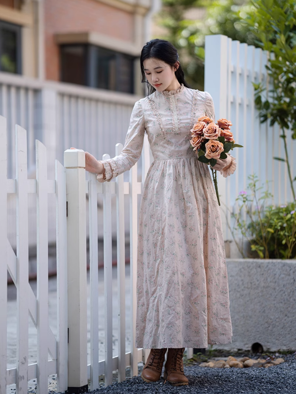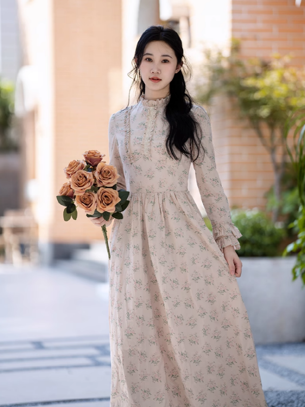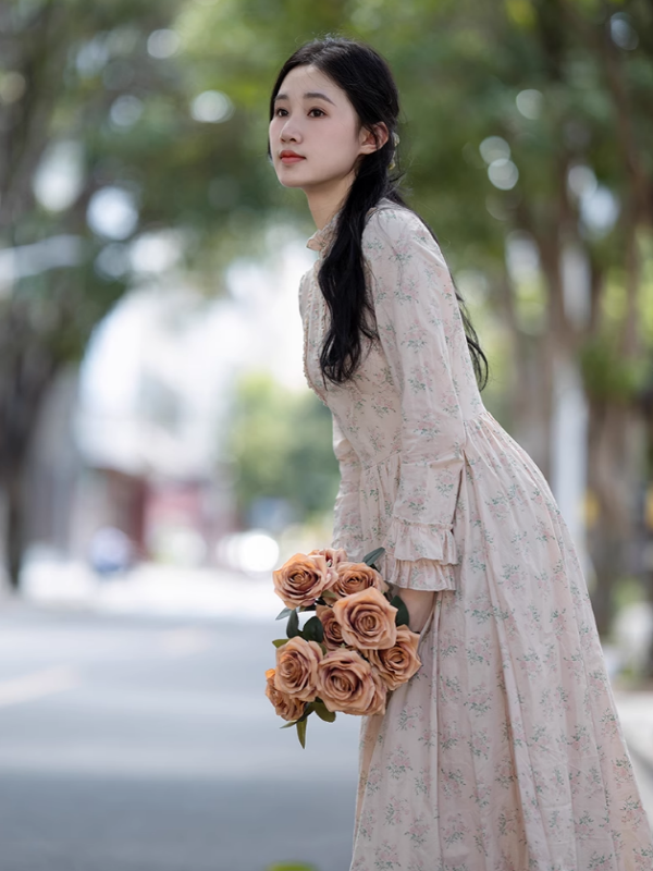 She stands amidst the symphony of spring, a living painting in her pale pink dress adorned with lovely floral patterns. The high neck and ruffles at the chest add layers of loveliness, while the double ruffles on the sleeves highlight her charm. The high waist gives way to a voluminous skirt, fluttering gently with every step she takes through the streets, holding a rose in her hand. Dancing through the trees, she embodies the warmth of spring, attracting gazes as she becomes one with the peak bloom around her. With each step, she weaves beautiful memories of spring days, making the streets her stage and the trees her audience.