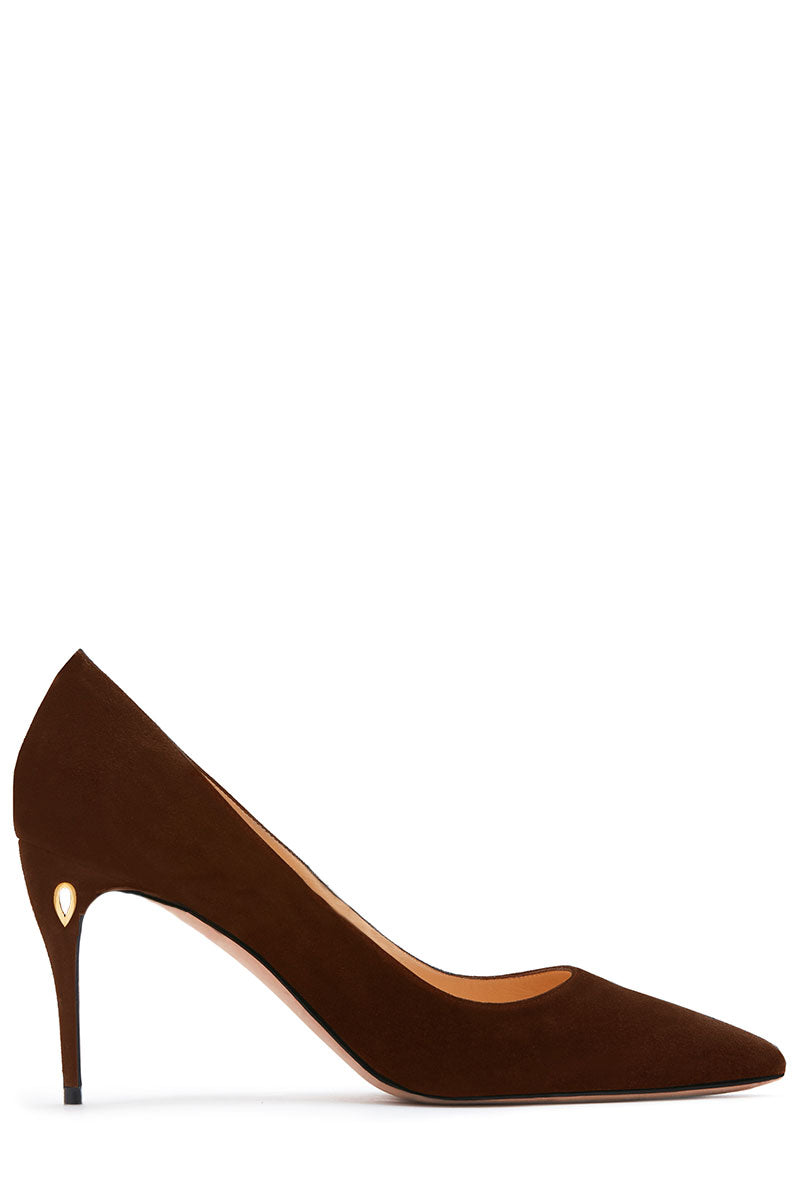 Where it all began. The iconic Lorenzo pump combines timeless elegance with Jennifer Chamandi’s patented ‘Eye of the Needle’ heel signature. Chocolate brown suede is handcrafted by Italian artisans into a comfortable and supremely balanced slip on pump with an 85mm heel—for the ultimate is chic comfort. The Lorenzo can be worn two ways: with or without a fine leather strap threaded through the Eye of the Needle and buckled across the foot, ensuring you get maximum mileage from your beautiful new shoes. The strap is removable for versatility, offering both a more classic and more trend-forward look