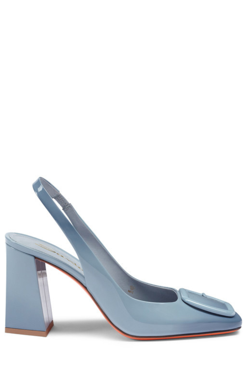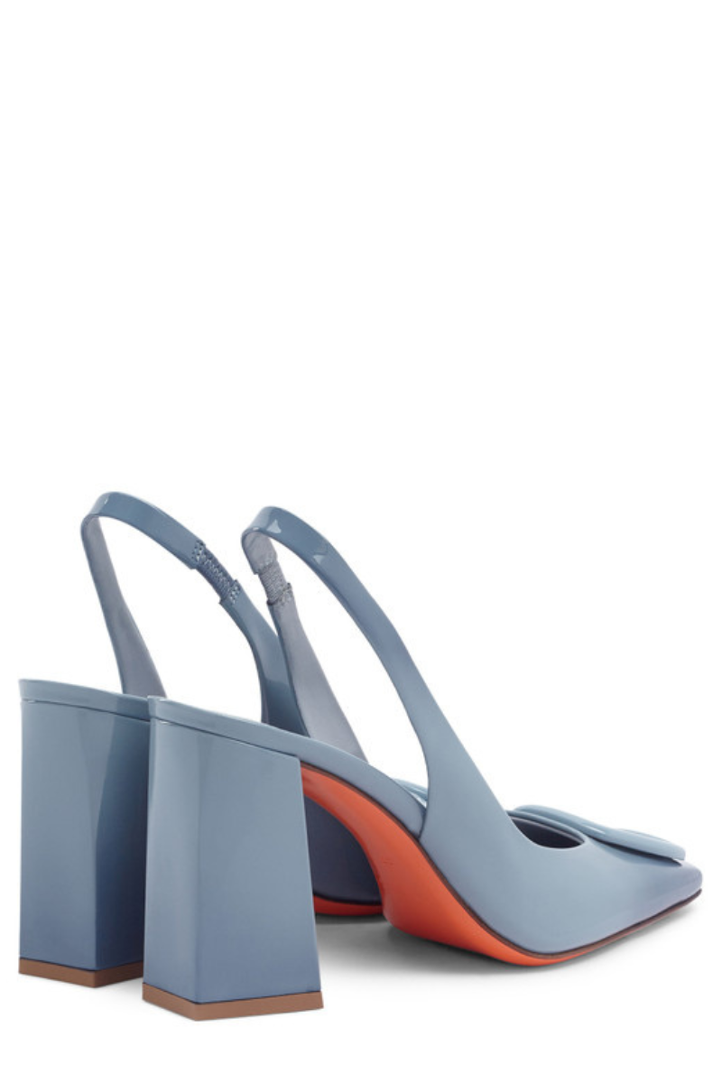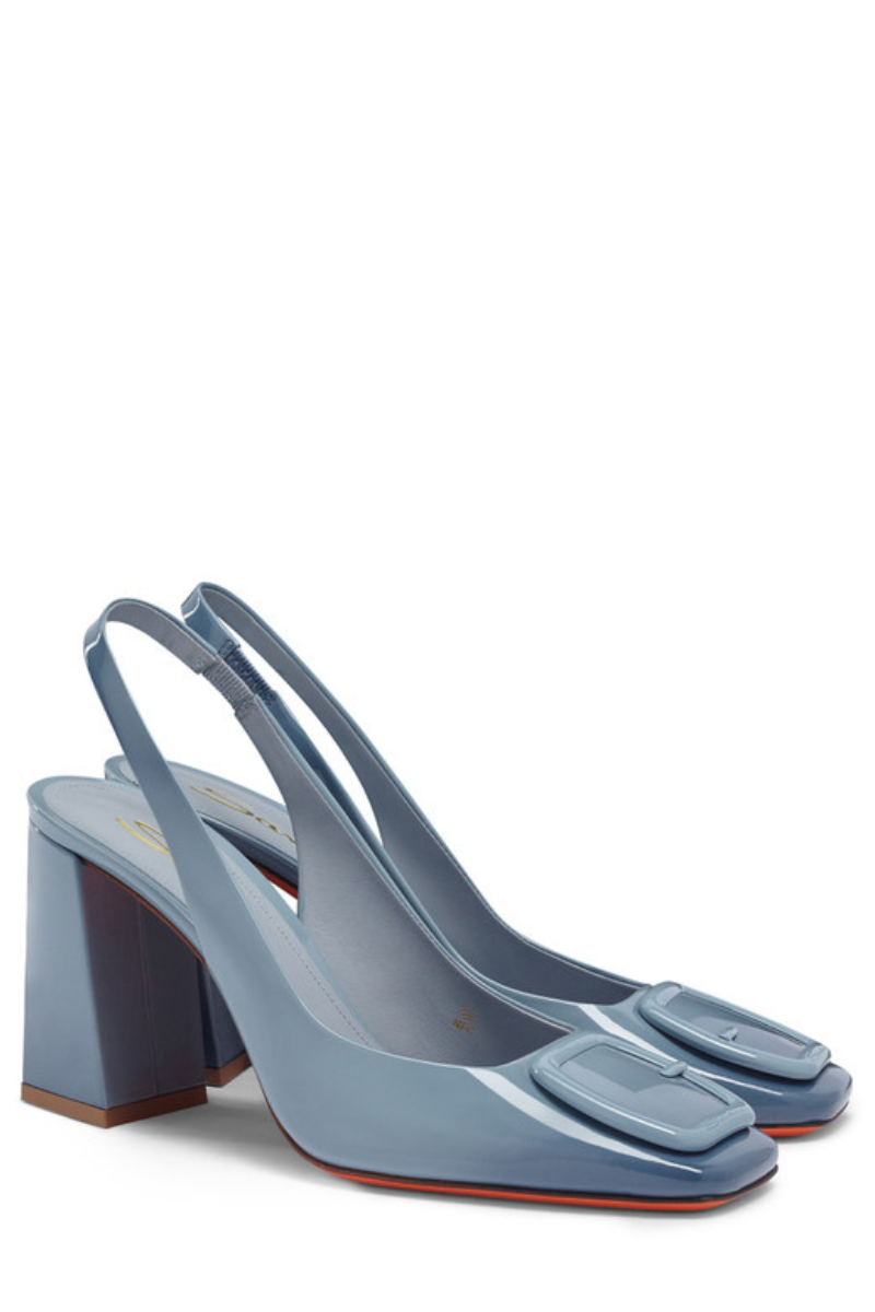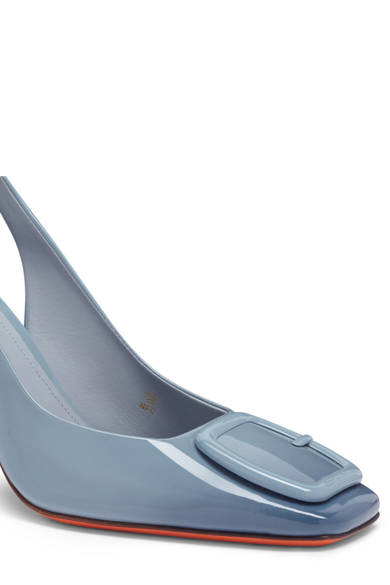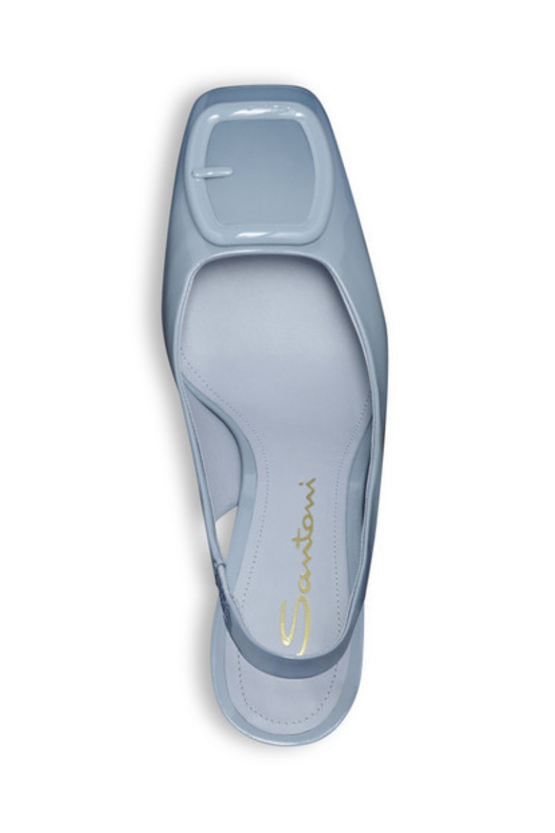 The very essence of feminine attitude, expressed through Santoni's signature aesthetic codes. This shoe recounts the brand’s unique universe with an iconic double-buckle detail and a sculptural silhouette with square toe and trapeze heel. Crafted from shiny patent leather, this elegant style is elevated with an elasticated slingback strap.