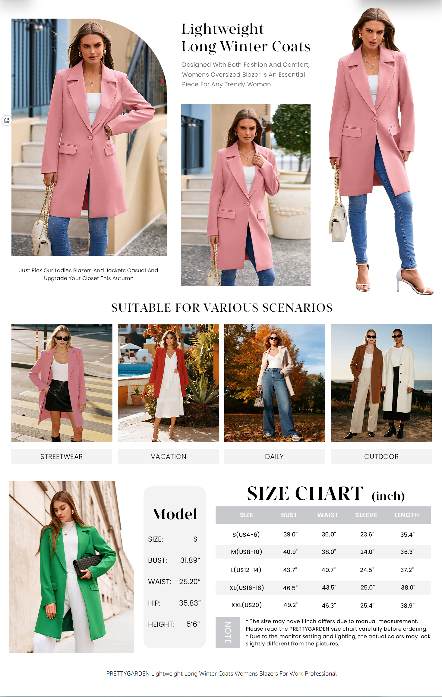 • Women's Spring Fall Long Blazer Jackets Long Sleeve Lapel Pockets Loose Fit Work Casual Blazers Outerwear