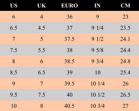 • Runs true to size, If you have a wider foot we recommend sizing up, more narrow foot size down.