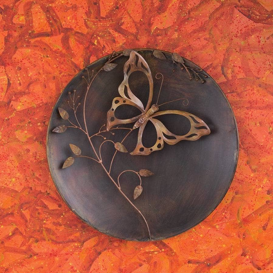 Adorn an indoor or outdoor wall with a unique, beautiful piece. Our 23” Flamed Butterfly on Branch Raised Wall Disc offers a lovely, sculpted look. With a slightly concave background of dark, burnished metal, it features a lace-winged garden visitor, rendered in contrasting flamed metal and gracefully poised alongside a curved, leafy branch. Wherever you place it, this piece is certain to evoke feelings of joy. Like all décor from our Happy Gardens collection, it has been individually handcrafted, and will bring lasting beauty to your home or garden.