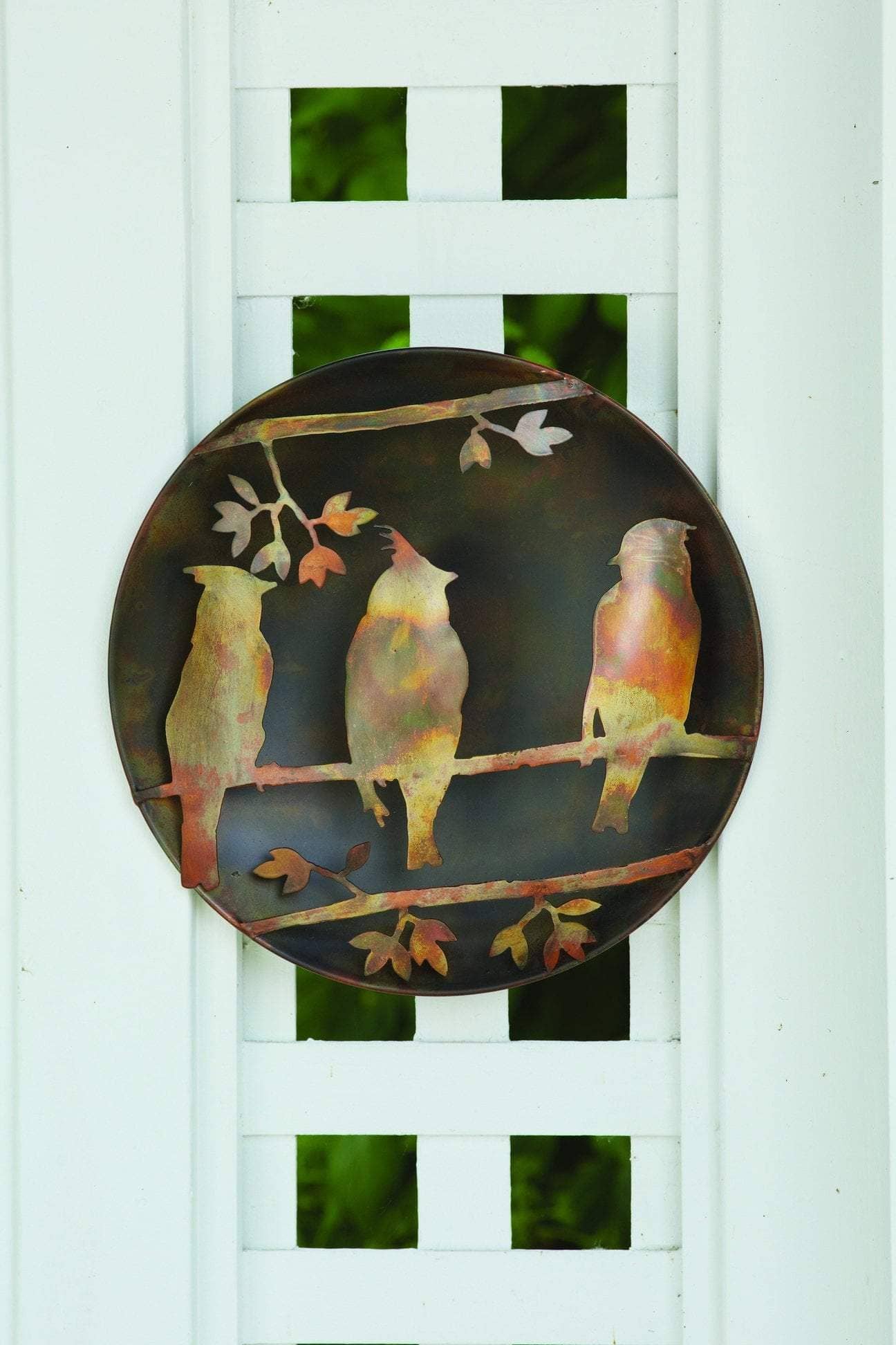 Add a touch of nature-inspired beauty to any space, indoors or outside! Our 12” Flamed Raised Cedar Waxwing Wall Disc features a trio of silhouettes, convincingly perched amongst leafy branches. It’s a wonderful gift for the birdwatcher in your life, and a fantastic addition to your own home, garden, or outbuilding. The flamed finish offers a beautiful glow, contrasting perfectly with the dark metal background. Like other Happy Gardens wall decor, this disc has been individually handcrafted, and will bring lasting beauty to your space.