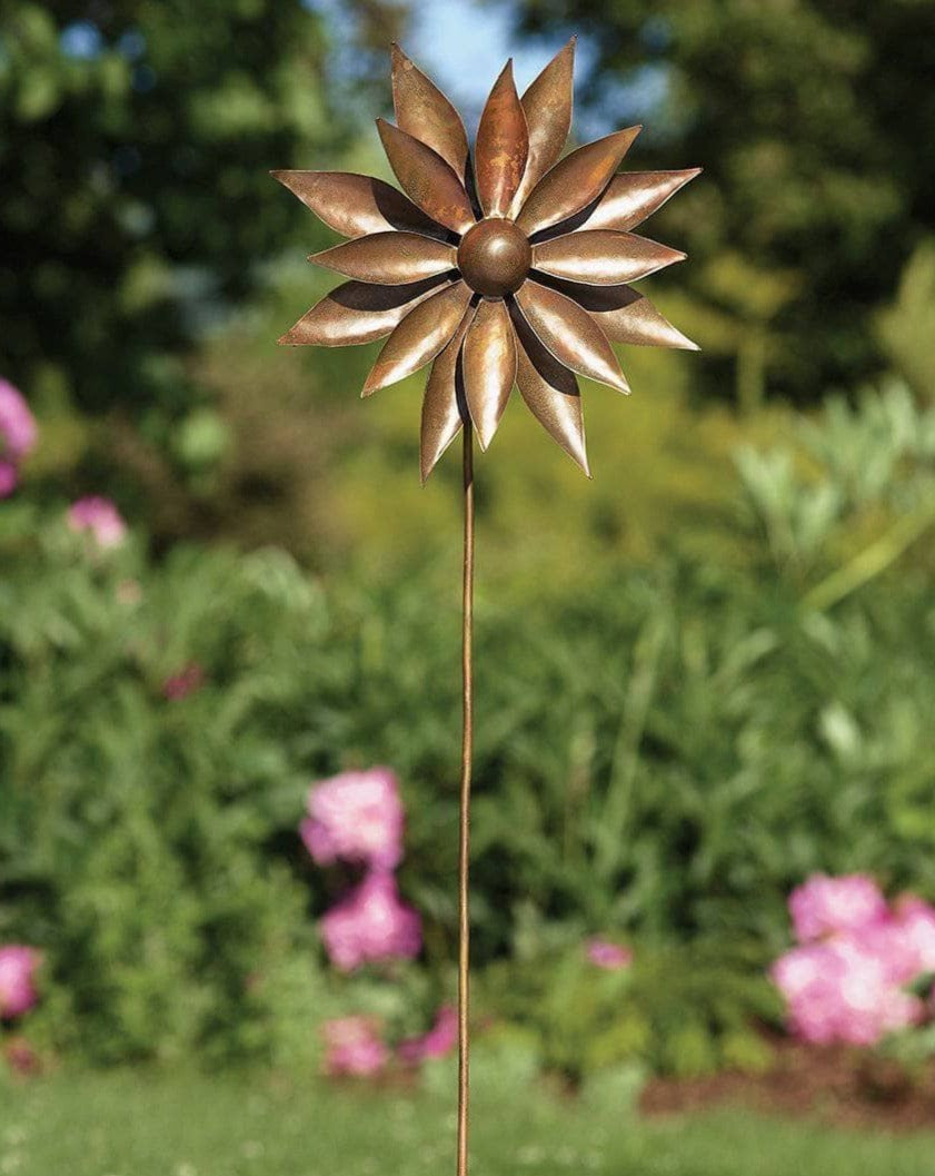 Perfect for displaying alone or in larger groupings, our 12-inch Dahlia Flower Spinner features two lush layers of sculpted petals surrounding a rounded center. A slightly curved stake provides strength while adding a whimsical finishing touch. Simply lovely! Like all Happy Gardens spinners, this one is handcrafted, and will bring lasting beauty to your landscape.